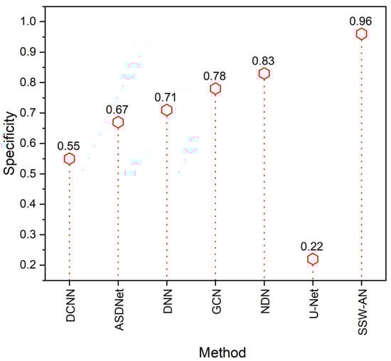 The contrast of the specificity can be seen in Figure 11. The proposed SSW-AN is more specific than other networks, such as DCNN, ASDNet, DNN, GCN and NDN, which are currently being used.