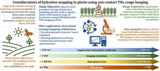 Apart from these considerations, the ultimate challenge is the implementation of THz technology as a portable, rapid, and reliable approach for hydration sensing/mapping, either on the laboratory scale or in the field, where uptake remains low [,]. Some of the system-level constraints include the overall form factor, weight, and cost of imaging systems; the source power and detector sensitivity of the THz technologies utilized therein; as well as the associated data acquisition and analyses times [,,]. Therefore, it is critical that a comparative study of contrasting THz imaging platforms, both broadband and single frequency, be undertaken in a methodical manner to determine the technical feasibility and comparative advantages of different THz imaging techniques [,], in terms of the acquisition and analyses. Such will engender the future toward the practical utilization of THz technologies in hydration mapping applications.
