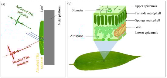 (a) Schematic showing interaction of THz radiation with the leaf sample (mounted on a metal platform) in reflection configuration and (b) the internal structure of a typical leaf and its main components.