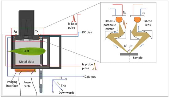 Schematic of the THz TDS imaging setup with leaf samples mounted on the metal platform in reflection configuration (the schematic in the inset is the zoomed-out area shown by the red box. It shows the propagation of THz radiation from the Tx to the sample and then from sample to the Rx).