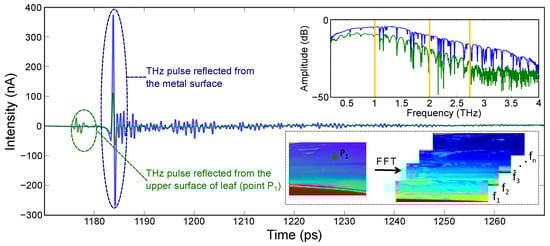 To obtain the amplitude and phase information of the signal, the experimental images were converted to frequency domain (by taking FFT) using Matlab. In PCA-based THz-TDI system, a broadband spectrum was recorded over the bandwidth of the system as shown in Figure 4. With the intention to monitor the leaf hydration level at different frequency instances, the amplitude and phase images were obtained at different frequency points, namely 1.0, 2.0, and 2.75 THz. The frequency lines for which the images were extracted are shown with orange lines in the frequency spectrum. Afterward, the amplitude and phase images were normalized with respect to the maximum value obtained from the image.