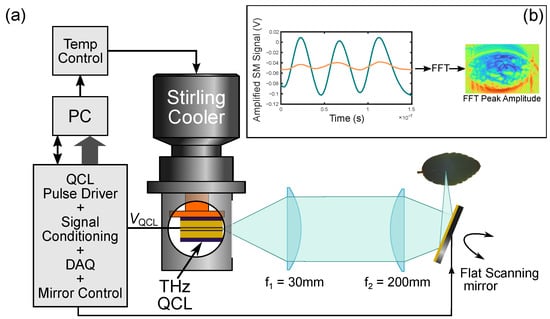 Laser feedback interferometry is a versatile technique which allows a laser—such as a THz QCL—to be used as both a source and detector of emitted radiation []. The nature of the LFI scheme takes advantage of the coherent property of the THz QCL, suppresses background radiation (which can be a problem for many external THz detectors []), and delivers a compact, self-aligned, highly sensitive interferometric THz transceiver [,]. When applied to imaging with appropriate calibration, the LFI sensor can be used to extract complex optical properties of the target [,,,]. Figure 5a shows the schematic of the QCL-based LFI imaging setup. The operating frequency of the THz QCL was 2.71 THz (measured via the method shown in []). A custom-built pulsed laser driver was used to drive the QCL. A mechanical Stirling engine cryocooler (Cryotel GT, Sunpower, Inc., Athens, USA) was used to maintain the operating point of QCL at 50 K. The THz radiation generated by the QCL was collimated (L1 Tsurupica d = 25 mm f = 50 mm) and focused (L2 TPX d = 100 mm f = 200 mm) on the target, with a path length between the QCL and the sample (leaf) being approximately ∼1.2 m. The QCL was driven by a train of current pulses, each consisting of a square pulse (of 500 ns duration) on which a smaller current ramp was superimposed. During the pulse, the total laser current was changed from A to A, with 25% duty cycle. This current ramp (superimposed on the square pulse) induces a QCL emission frequency sweep ( 600 MHz), causing the formation of interferometric fringes that contain information about the target []. These fringes are extracted from the change in terminal voltage across the QCL (the self-mixing (SM) signal) []. Specific details of the exact driving and signal recovery process can be seen in []. The post-objective scanning configuration was chosen to perform the image acquisition. In this situation, a 3-inch-diameter fast scanning mirror was located between the focusing lens and the target, at 50 mm distance from the focusing lens. This configuration, while simple to implement from an optical viewpoint, has the disadvantage that the focal plane is curved and is less common than the pre-objective scanning arrangement [,]. However, it offers a relatively high resolution over large scan area. In this case, the scan area with a good image quality was increased from ∼ mm to ∼ mm (while using the same f = 200 mm lens) by replacing the pre-objective with the post-objective scanning architecture. For an interferometric imaging system like the LFI, the filed curvature manifests itself through the appearance of dominant concentric equiphase areas, rendering the useful phase information more difficult to interpret. Without the additional correction technique, the fast scanning LFI essentially becomes a predominantly amplitude detecting scheme.