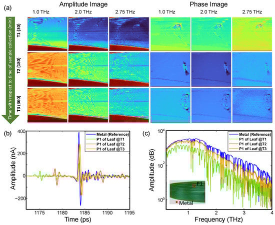 (a) Amplitude and phase images of a Bambusa vulgaris leaf acquired after 30 min (T1), 180 min (T2), and 360 min (T3) from plucking, extracted at different frequency points. The color contrast in amplitude image represents variation in reflectivity while the color contrast in phase image represents the variation in phase accumulation. For a continuous progression from 1 to 3 THz, see Video S1, and (b) THz time-domain response and (c) amplitude spectrum of leaf (from position P1) and metal acquired at time T1, T2, and T3, showing degree of dryness in the leaf. The visual image of the leaf is shown in the inset of the amplitude spectrum and the data were extracted from pixels shown in red in the inset.