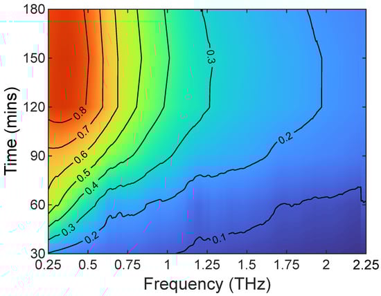 A particular advantage of TDS is not only being able to determine where from in the leaf the signal is coming but to also work out from the absorption coefficient what hydration level and thickness of the leaf leads to what depth with frequency. Figure 7 shows this change in the calculated penetration depth vs. frequency and time for a single measurement. As the leaf is drying out over time, the change in time is really representative of a change in hydration. This is important as it can then be used inversely to estimate the thickness of the leaf and relate what is the frequency of the leaf spectral reflectivity, transmissivity, or a combination of both.