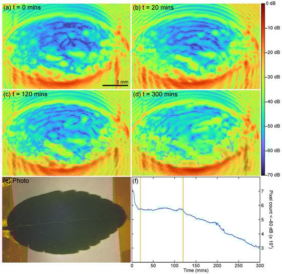 (a–d) LFI images of Celtis sinensis at t = 0, 20, 130, and 300 min. For a continuous progression from 0 to 300 min, see Video S2. (e) Photo of leaf after LFI scan (300 min +). (f) Change in count of ‘blue’ pixels (Amp. < 60 dB) vs. time. Horizontal lines indicate 20 and 120 min.