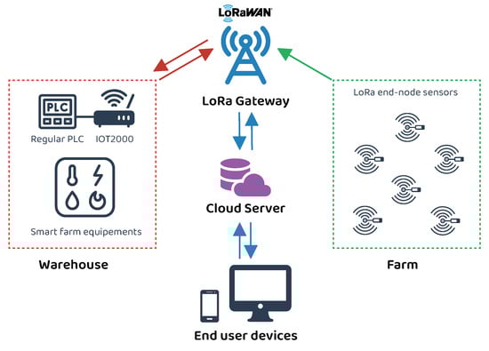 Illustration of the smart farming application. The proposed IoT system integrates different devices and technologies: PLC controllers and LoRa nodes connected via a gateway. The gateway forward and receive data from the cloud server that hosts the web application.