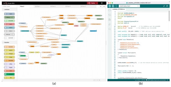 (a) NodeRed dashboard, it provides a browser-based editor that makes it easy to wire together flows using the nodes. (b) a part of the code used to program the LoRaWan communication of the SIMATIC IoT2040.
