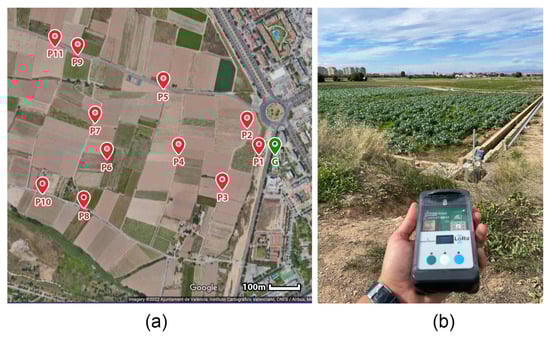 The LoRa end-node was placed in several locations with different distances from the gateway. From each transmit location, 10 messages were exchanged between the end-node and the gateway. The location of the LoRa gateway and the different measurement positions (P1 to P11) are represented in Figure 4. The Spreading Factor (SF) was fixed in 7 in order to reach the maximum distance. However, in similar applications it is preferred not to fix the SF and set Adaptive Data Rate (ADR) mechanism for optimizing data rates, airtime and power consumption, and consequently improve the range and capacity of the network.