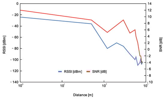 The RSSI and SNR variation as a function of the distance are illustrated in Figure 5. As seen, the RSSI decreases as the distance increases. The first packet loss was at position P6 (550 m); from position P5 and above, the RSSI decreased under −90 dBm. Concerning SNR, it followed a similar trend: the SNR value stayed above 0 dB until P9 (720 m) and then, it decreased to −4 dB at P11 (795 m). The lowest rate was registered at P8 (640 m), whereas at P11 (795 m) the received packets reached 60%. This test shows that distances under 500 m can guarantee successful communication between end-nodes and the gateway.