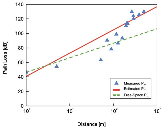 Using the experimentally collected data of Table 3, the PL was calculated using the Equation (2). The results are compared with the Estimated Path Loss (EPL) along with the Free-Space Path Loss (FSPL) model and are illustrated in Figure 6. These results shows he proposed model to estimate the path loss appears to be more valid as the distance increases. For distances shorter than 70m, the proposed model shows instability that mainly return to the shadowing effects [28]. Packets with a PL lower than 126 dB can be received. As would be expected, the free space model FSPL shows the lowest attenuation.