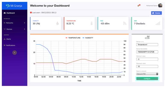 The presented smart farm system requires a tailored application to customize the control and analysis of data and provide more flexibility in its management. To meet this need, we have developed a personalized web application called ‘Mi granja (My Farm)’, using the Laravel framework [35] for back-end operations and a MySQL database. We decided to implement a relational database due to its ability to provide easier management and maintenance of data quality and integrity over time. This is due to features such as data consistency, query flexibility, transaction support, and scalability, which can be beneficial for the long-term sustainability and robustness of the application. Alternatively, a non-relational database could also be utilized for this purpose. The front-end of the web application is developed using the Bootstrap framework, which implements a responsive design that is supported by multiple screen sizes. The web application allows users to easily access and analyze the data collected by the sensor nodes, as well as remotely control the machines connected to the PLC. It also provides a user-friendly interface for configuring the system settings and defining custom alerts and notifications. The web application is hosted on a cloud server, enabling users to access it from anywhere with an internet connection.
