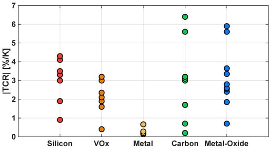 In the case of semiconductor micro-bolometers, the TCR is typically a negative value, which means that the resistance decreases as the temperature increases; moreover, it is strictly dependent on the material used to coat the sensing membrane of the micro-bolometer, as previously reported in Figure 1.