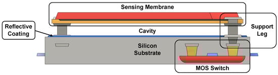 In order to reduce heat flow, the sensing membrane needs to be suspended; this is achieved through the use of various types of supporting structures known as legs. In earlier micro-bolometers, the sensing layer was directly deposited on the substrate, and a cavity was then etched beneath it: this meant that all the necessary interconnections and devices to bias and read the pixel had to be integrated beside the micro-bolometer, leading to a poor filling factor. With the advancement of MEMS fabrication processes, a two-level structure, in which the micro-bolometer is separated from the substrate, has become possible, as depicted in Figure 2 and Figure 3; with this arrangement, all the required interconnection circuitry can be integrated into the empty space under the pixel, and heat flow is only possible through the supporting legs, which also serve as an electrical connection between the sensing element and the rest of the system. Another consequence of the MEMS technological development is the possibility to create compact, robust and low thermal conductance supporting structures; in addition, it is now possible to completely separate the IR absorber from the sensing membrane by creating an umbrella structure (not shown) above it, which maximizes the filling factor [23]. The cavity between the sensing membrane and the substrate is used to reduce heat flow; for this reason, the entire detector is enclosed in a rigid metal package under vacuum. The cavity can also be used to enhance the absorbance of the micro-bolometer by controlling its height; if the distance between the sensing membrane and the substrate is chosen to be equal to , where is the infrared wavelength of interest, the void acts as a Fabry–Perot optical cavity and this increases the performance of the micro-bolometer. To maximize this effect, the substrate under the sensing plate is coated with a reflective layer, typically aluminum, and the top of the membrane is covered with an anti-reflective material.