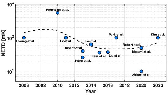 where F and are parameters that take the optics of the system into account; is the change with respect to the temperature of the power per unit area emitted by a blackbody within the spectral band form to , and it is measured in Kelvin [25]. Considering the great relevance of this parameter in this framework, Figure 4 reports the NETD trend of the last 17 years, taking the main micro-bolometer works published in this timeframe into account [1,2,3,5,14,16,17,21,22,27,28,29,30]; the dotted curve has been obtained by a log-scale adapted smoothing spline method [31]. It can be noticed that the trend line exhibits a negative slope across the 2010–2016 period; however, this behavior extends no further since, in typical applications, a NETD value in the order of 100 mK is considered sufficient.