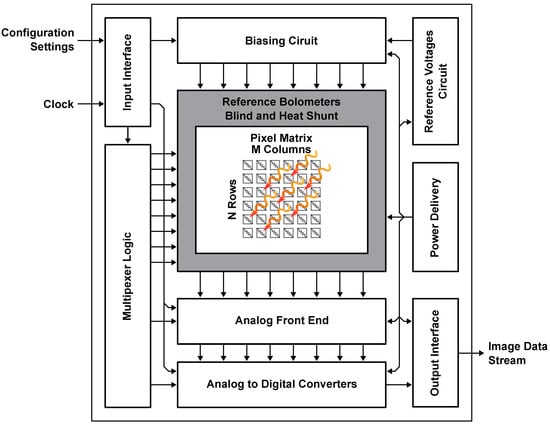 Uncooled micro-bolometer InfraRed Focal Plane Arrays (IRFPAs) are a type of infrared detector that is commonly used in thermal imaging applications. It consists of a two-dimensional array of micro-bolometers, which are tiny thermally sensitive resistors that are used to detect the infrared radiation emitted by objects in the detector’s field of view; these sensing elements are placed on a silicon substrate and are typically fabricated using a Micro-Electro-Mechanical System (MEMS) technology. This type of detectors offer a relatively high spatial resolution and sensitivity; this allows the arrays that compose them to accurately detect and distinguish between objects with small temperature differences. Another key advantage is that they do not require any external cooling; this makes the thermal imaging system more portable, easier to use and ideal to be employed in a large variety of fields. For example, in military and security applications, micro-bolometer IRFPAs can be used to detect the presence of humans or vehicles in low light or obscured visibility conditions, such as fog, smoke or darkness [1,2,3,4,5,6,7,8,9,10,11,12,13]. In the industrial and building inspections framework, they can be exploited to identify and diagnose problems in electrical systems, mechanical equipment and building insulation, whereas, in leak detection, they can be used to identify and locate leaks in pipes, roofs and other structures [1,2,3,5,12,14,15,16,17]. In the medical field, instead, they can be employed to detect and monitor temperature changes in the human body, such as in fever screening or as a diagnostic tool for various medical conditions [1,3,4,6,8,12,14,15,16,17,18,19]. Moreover, in agriculture, they can be used to detect crop stress, identify pests and monitor irrigation efficiency [20]; in addition, in the environmental framework, they can be exploited to monitor the health and status of wildlife, detect changes in land and water temperatures and monitor the performance of renewable energy systems, such as solar panels [1,17,18]. Furthermore, in the automotive industry, they can be used to detect problems with a car’s engine, transmission or brakes and for pedestrian detection and night vision [5,10,12,21,22]. Finally, in research and development, they can be adopted to study and understand the heat transfer and the thermal behavior of materials and systems [12,13,15].