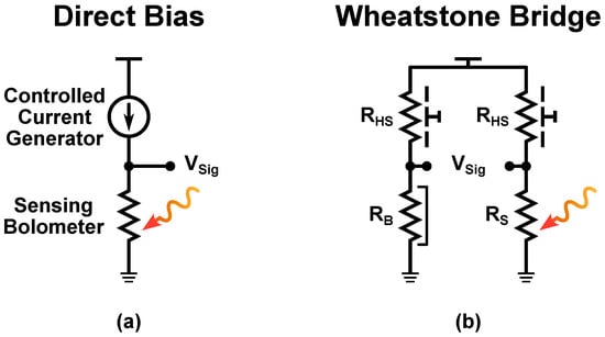 The most simple voltage mode readout structures are based on the use of a current generator to directly bias the micro-bolometer [2,10,14,18,39], as shown in Figure 6a, or on a Wheatstone bridge [40], as shown in Figure 6b. In the first case, the generator used to bias the sensing device does not provide a constant current, which is instead digitally controlled [2,5,10] or generated by analog circuits that make it dependent on [14], in order to compensate for the FPN. When a Wheatstone bridge is used, on the other hand, a heat shunt and a blind micro-bolometer are employed in combination with the sensing one; this allows the compensation for both self-heating and substrate temperature non-uniformity effects.