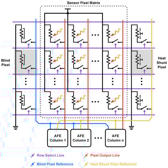 In both reading modes, blind micro-bolometers [17,30,34], heat shunt micro-bolometers [3,21,28] or a combination of the two are used as a reference in the majority of the compensation strategies implemented to minimize the self-heating and the substrate temperature () variation effects. The blind micro-bolometer has the same structure as the sensing ones, but after its fabrication, it is coated with a reflective film that blocks all the IR radiation; in this way, its resistance change depends only on the other sources of heat. Heat shunt micro-bolometers, instead, are constructed to have a high thermal conductance with the substrate (exactly the opposite with respect to the sensing micro-bolometer); in this way, their temperature is not affected by the bias and can be employed as a reference.