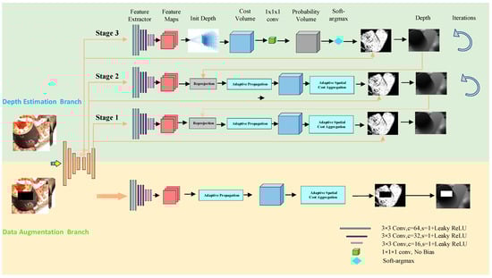 Network structure model. In the depth estimation branch, the depth map is initially initialized, and the depth map is obtained by calculating the cost body, 3D convolution, soft-argmax and other operations. Each stage can have multiple iterations. Upsampling the depth map can be used as the initial depth map for the next stage. The data augmentation branch and the depth estimation branch share weights in the feature extraction stage.