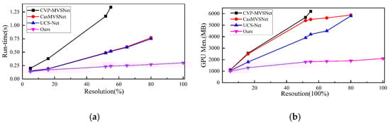In addition to the evaluation metrics on the dataset, calculation time and memory consumption are also important metrics used to evaluate the model. The proposed algorithm is compared with several state-of-the-art learning algorithms, such as CasMVSNet [], UCS-Net [], and CVP-MVSNet [].