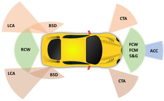 Schema of different radars installed on a vehicle and functionalities. Long range: ACC (Adaptive Cruise Control). Short/Medium range: BSD (Blind Spot Detection), LCA (Lane Change Assist), CTA (Cross Traffic Alert), FCW (Forward Collision Warning), FCM (Forward Collision Mitigation), RCW (Rear Collision Warning), S&G (Stop and Go).