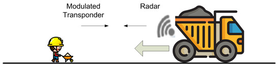 Worker carrying a transponder and a heavy vehicle moving backward equipped with a radar.