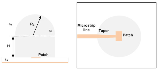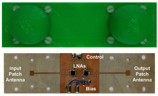 An improved version of the mm-wave tag designed for car-to-car communication with an FMCW radar in [23] is used here to obtain experimental results. Details of the designed tag were recently presented in [25], where the tag is employed as a spoofing device for FMCW radars. The main characteristics are summarized below. The block diagram of the modulated tag, which is used as a Radar Target Enhancer (RTE), is shown in Figure 4. It has been designed using Commercial Off-the-Shelf (COTS) components and consists of an amplifier connected between two antennas. The incoming signal from the radar is received by one of the antennas; it is amplified and retransmitted through the other one. The amplifier consists of two low-noise amplifiers (LNA) connected in cascade to increase the gain. The LNAs are two Silicon Germanium (SiGe) MMIC (Monolithic Microwave Integrated Circuit) amplifiers (model LNA_24_04 from Silicon Radar GmbH). Each amplifier achieves a typical gain of 17 dB between 24 GHz and 29 GHz and only consumes 5.6 mA at 3.3 V. The modulation of the radar cross section (RCS) uses a power-down control pin, which is connected to the modulation signal. It is used to enable/disable the amplifiers, controlling the backscattered amplitude. Thus, there is no need to include an expensive mm-wave modulator into the system since the modulation of the RCS is carried out by switching the supply voltage of the amplifier. A photograph of a prototype of the tag is shown in Figure 5. It is manufactured on Rogers 4003 substrate (dielectric constant and height h = 16 mil). Microstrip rectangular patch antennas have been designed with two 3D-printed dielectric lenses on top (Figure 6) to increase their gain up to 17.5 dB. The lenses’ prototypes are manufactured with polylactic acid (PLA), whose complex dielectric permittivity has been characterized at a millimeter band in [38], obtaining a dielectric constant of 2.55 and a dissipation factor of 0.02 at 24 GHz. To improve matching, a tapered access line is included. The antenna covers the 24–24.25 GHz ISM band and has been simulated using Ansys HFSS. In order to protect the electronics, the tag and both lenses are inserted into a PLA box made with a 3D printer. Details of the dimensions and measurements of the antenna can be found in [25].