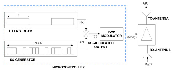Note that, in (13), the sequence multiplication operation must be replaced by the XNOR operation if the sequences are coded in the binary system (0 and 1) instead of the bipolar one (−1 and 1). If the value of the sequence is 0 (or −1 in the bipolar system), the PWM frequency is set to , whereas, if , the PWM frequency is set to . Chip time duration is assumed to be much longer than the PWM period. By using this modulation schema, both Amplitude-Shift Keying (ASK) modulation, if , or Frequency-Shift Keying (FSK) modulation, if , can be implemented.