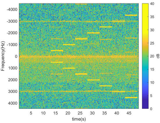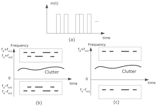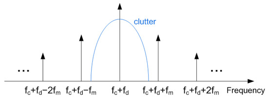 Some of the clutter contributions may have higher amplitude than the signal coming from the tag itself (e.g., reflections on the road or on other cars, etc.). The signal coming from the tag can be separated from the clutter thanks to signal modulation. Assuming an urban environment, the maximum speed is limited to 30–50 km/h. Therefore, the allocation of the modulation frequency at a region that is expected to be free from clutter contributions can help to detect the tag (see Figure 8). In addition, the information is double-sideband modulated at . This fact can be used to distinguish a tag from other objects that may generate components in the Doppler spectrum. Note that the different components that constitute the clutter do not experience exactly the same Doppler shift since the relative velocities may be different than the moving tag.