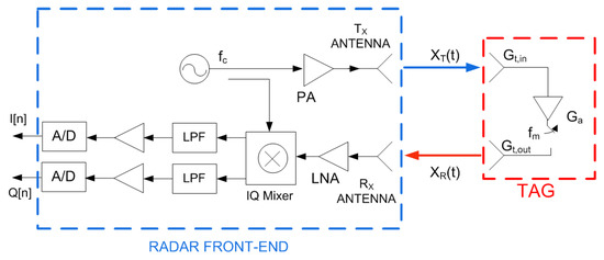 - A modified and improved version of the tag designed in [23,25] is used to obtain the experimental results. Here, the tag includes a Monolithic Microwave Integrated Circuit (MMIC) amplifier, which allows for increasing the amplitude of the backscattered signal, making tag detection easier in environments with high clutter;