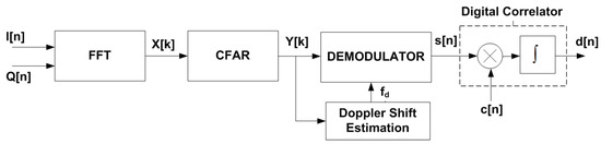 The extracting data operation is performed by multiplying the received signal by the pseudo-noise sequence and integrating the result. This operation can be easily performed by correlating or convolving the received signal with a replica of the spread code. In low-cost radars, low-power microcontrollers with relatively low clock frequencies are used. Therefore, the number of bits per chip is limited by the time required to perform the FFT and computer operations. The immediate consequence is that there is a limitation in the transmission velocity. Another limiting factor, especially where the relative velocity is high, is the time during which the radar has the tag within its field of view due to the short range of the system. If the scanning time (the time the radar illuminates the tag) is too short, the received sequence may be cut off and not fully received.