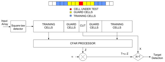 A crucial point for the correct processing of the signal is determined by the separation of the reflections from the target in the Doppler spectrum. As long as the received signal that is composed of the target reflections, noise and clutter reflections is greater than a threshold, detection for the specific frequency cell will be considered. In order to determine this threshold, a one-dimensional Constant False Alarm Rate (CFAR) has been used. The detection is based on the estimation of a threshold from a set of training cells. Different CFAR processors have been proposed in the literature to perform this estimation. The well-known Cell-Averaging Constant False Alarm Rate (CA-CFAR) noise estimation is obtained by averaging the values of the cells in the training area. In the CA-CFAR, the threshold is computed by taking the average amplitude of the cell around the Cell Under Test (CUT). In this averaging process, some cells (guard cells) around the CUT are excluded to avoid the influence of the CUT level in the calculation (see Figure 12). The threshold can be implemented using a digital filter: