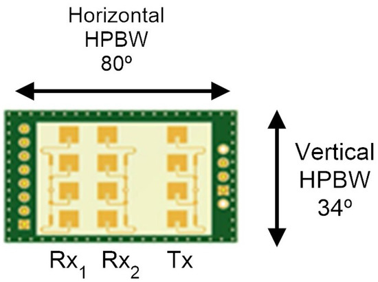 The experimental results have been obtained using a low-cost Doppler radar K-LD7 model from RFbeam Microwave GmbH. Figure 13 shows an image of the radar module including the receiving and transmitting antenna arrays. The radar works in the 24 GHz ISM band and transmits an EIRP of 6 dBm. The antenna gain is 8.6 dBi. The horizontal and vertical −3 dB beam widths (HPBW) are respectively 80 and 34. The radar has two receiving antenna arrays with a separation between them of d = 6.223 mm. This radar can operate in FSK mode, using two transmission frequencies. However, for the sake of simplicity in this work, we are going to focus on tag-to-radar c ommunication in which only one receiving channel (Doppler radar) and one transmission frequency are required. The FFT is performed from the ADC samples taken by the microcontroller included in the radar board. The Fourier samples were sent to the host computer via the USB port. The rest of the signal processing is carried out on the host computer. The signal processing in the host computer is implemented in Matlab and Python. Therefore, both PC and other platforms such as Raspberry Pi can be used as host computers.