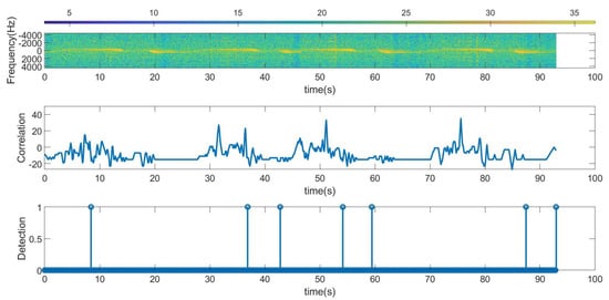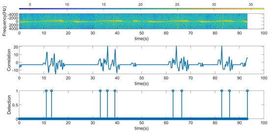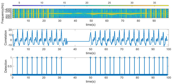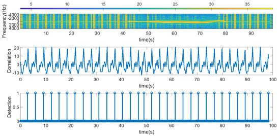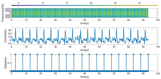 Measurement for a moving scooter sending Barker codes with length 13. From top to bottom: raw spectrogram before the CFAR processor is applied, the output of the correlator and tag detection.