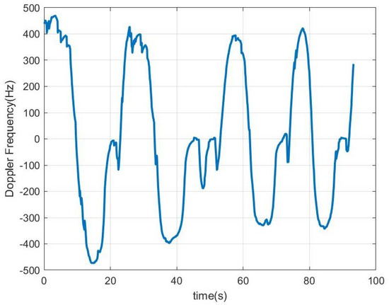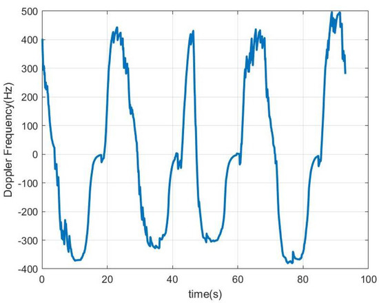 In Figure 18, Figure 19, Figure 20 and Figure 21, the scooter is moving. The scooter passes in front of the radar periodically at different velocities and returns to the original position after traveling about 15 m. When the tag was within the radar reading range (limited to about 10 m due to the transmission power of the radar used in this work), the received data can be observed. A frequency shift appears due to Doppler. The trace at low frequencies observed in the spectrogram is caused by reflection from the metal parts of the scooter and the body. The Doppler frequency is variable and also depends on the orientation angle between the radar and the scooter (see Figure 19 and Figure 21). The Doppler shift is estimated from the peak of the spectrum in the frequency range between −1000 and 1000 Hz. Additionally, a smoothing filter is applied to reduce noise in the estimation: