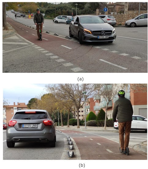 The concept of vulnerable road users refers to pedestrians, persons living with disabilities, the elderly, cyclists, people that work in the road and more recently scooter riders who are easily injured in a space dominated by cars, both on roads and on city streets. In addition, within the framework of the fight against climatic change and the reduction of emissions, cities are promoting the adoption of cycling infrastructures [15]. This policy change is reflected in the increase in both bicycle sharing and the number of bicycles and scooters. In most cities, some vehicle lanes have been removed to become bicycle lanes. An important number of vehicle collisions with vulnerable road users occur in places with low light, either at night or due to adverse weather conditions [9,16]. The ability to detect users by means of a vehicle-equipped radar strongly depends on the power backscattered by these users, which is also proportional to their Radar-Cross Section (RCS). The RCS is a complex magnitude that depends on the orientation, polarization, size, and materials [17]. The RCS of a pedestrian at 24 GHz is around −11 dBsm [18] and is affected by his position, clothing or other high reflective objects (jewelry, mobiles, etc). This value is significantly lower than the one of a standard car (18 dBsm) or a motorcycle (5–8 dBsm) [19]. Recent advances in mm-wave technology open the door to new radar bands at 77 GHz, which achieve better range resolution due to the larger bandwidth available with respect to radars at lower frequency bands. In addition, the RCS of elements on the road is also higher at 77 GHz than in the 24–26 GHz band (on the order of 5–7 dB [20]), but the problem of detecting objects such as pedestrians or bikes with low RCS is still unsolved. In addition, the speed of pedestrians and bikes is very small (<15 km/h for pedestrians). Therefore, these vulnerable road users can be confused with clutter due to the presence of large static objects such as the soil ground or metal parts such as traffic signs and crash barriers. This situation is common in cyclists or scooters riding on roadsides, intersections with bike lanes (Figure 2), and workers doing road maintenance or near heavy machines (Figure 3). It is in these situations, where the safety of the pedestrians, workers or cyclists would be greater if they were equipped with a modulated transponder that responded to short-range radar installed in vehicles.
