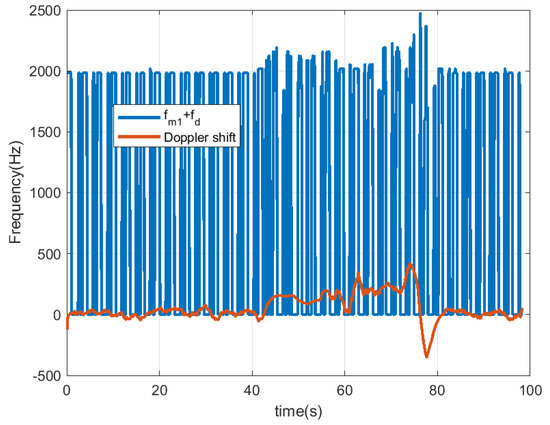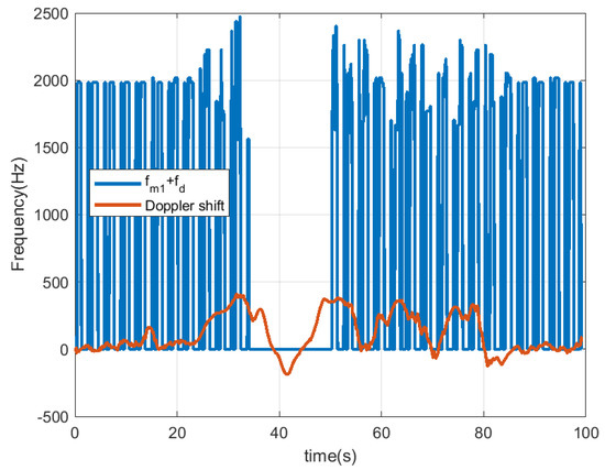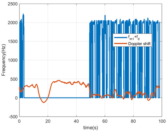 The estimated Doppler shift corresponding to the low-frequency band of the spectrum is due to the contribution of all objects and clutter in the scene. Therefore, it changes in the presence of large reflectors such as another car (stopped or moving) that is within the angular width of the antennas. However, the value of the Doppler shift is only used to determine the position of the center of the window to be used in the spectrum peak searching algorithm to demodulate the bits. Since this has a maximum value of 1000 Hz, errors in the Doppler shift estimate caused by the scooter generally do not affect the result. The previous figures show the plot of the frequency of the peak detected when bit 1 is sent, superimposed with the plot of the estimated Doppler shift. In these figures, the peak frequency detected for bit 1 () approximately follows the variations of the Doppler shift.