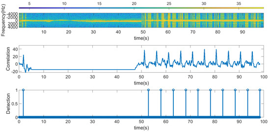 Data measurement using length 7 Barker codes when the scooter is in motion. From top to bottom: raw spectrogram before CFAR processor is applied, the output of the correlator signal and tag detection. In this case, the tag is partially out of range.