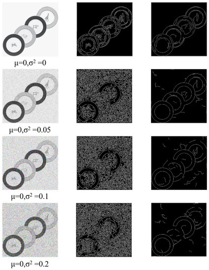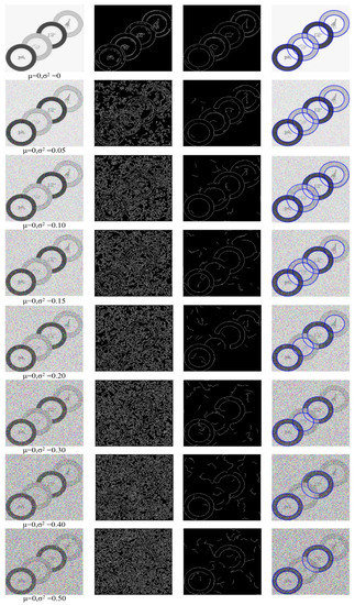 To test the performance of each algorithm under different levels of noise, we selected an image with a clear background and a circle consisting of strong edge points and weak edge points at the same time. The following Figure 4 shows the detection ability of our algorithm on images disturbed by Gaussian noise. The first image in each row represents different images disturbed by Gaussian noise with different variance. Additionally, the second image represents the result of edge extraction by adaptive canny algorithm. It can be seen from the results that the noise interferes with the boundary very seriously. The third picture is the intermediate result after we processed the picture. It can be seen that our algorithm reduces the noise as much as possible while retaining the arc. With interference, the fourth image is our circle detection result.