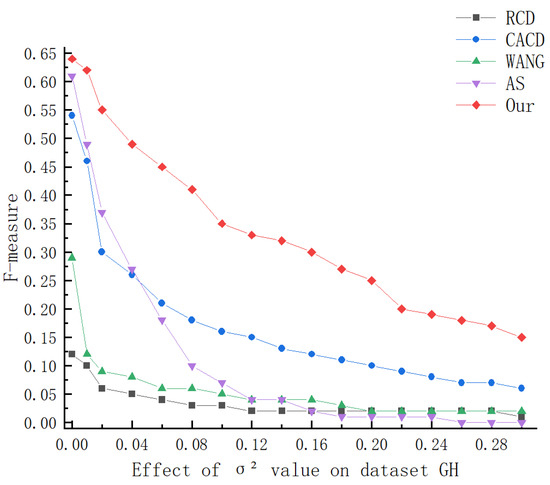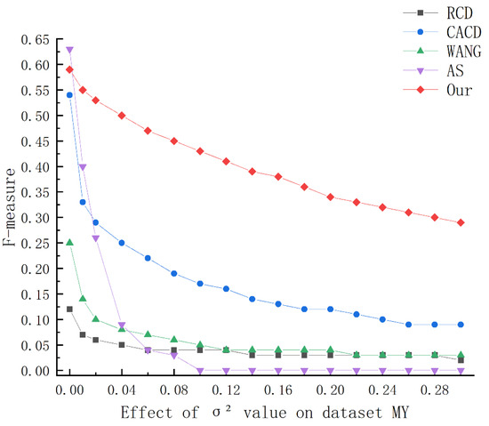 The following Figure 6 and Figure 7 show the change of the F-measure in more detail. As the noise increases, the performance of all algorithms decreases to a certain extent. When the variance of Gaussian noise increases from 0 to 0.01, The performance of the Wang, CACD, and AS algorithms degrade more obviously. Additionally, although the AS algorithm has good performance in the case of no noise, its anti-noise performance is the worst. On the data set MY, the variance is higher than 0.1, and AS cannot detect any circle. The performance of the algorithms of RCD and WANG will quickly stabilize at a low level under noise interference. Although the anti-noise of CACD algorithm is better than AS, RCD, WANG, with the increase in noise, the time required for the program to run also increases rapidly. As can be seen from the above figures, with the increase in noise, the performance of our algorithm drops significantly slower than other algorithms, and the running time of the program is within 0.1 s.