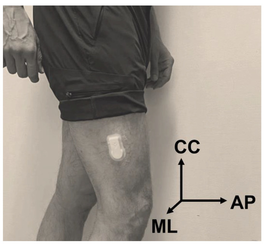 The photograph demonstrates the employed inertial measurement unit (IMU) at its location on the lateral distal side of the thigh and the corresponding coordinate axes (CC: craniocaudal, AP: anteroposterior, ML: mediolateral).