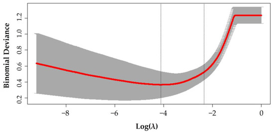 Cross-validation plot for the penalty coefficient (λ). Two vertical dashed lines correspond to the λmin and λ1se to the left and right, respectively. The x-axis regards the logarithm of λ.