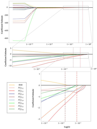 Figure 3 shows the shrinkage in the estimate of the coefficients for different values of the penalty parameter (λ) in the logistic LASSO regression model. We could demonstrate that 13 out of 22 coefficients (including age, sex, ω, and certain signal frequency powers) vanished with λ less than 10−8. Increasing λ beyond λmin led to excluding four other coefficients, among others, BMI. At λ1se, five variables remained in the model, out of which the power of the sixth frequency in the ML axis was close to zero and nullified soon afterward. Overall, four coefficients lasted in the model longest, i.e., the most determining features in distinguishing between the gait acceleration signals of osteoarthritic and non-osteoarthritis knees. These four features included the power of the second, fifth, and sixth frequencies of the CC axis and the power of the fifth frequency in the AP axis. The 95% CI and p-values for the coefficients at λ1se demonstrated similar results (Table 4).