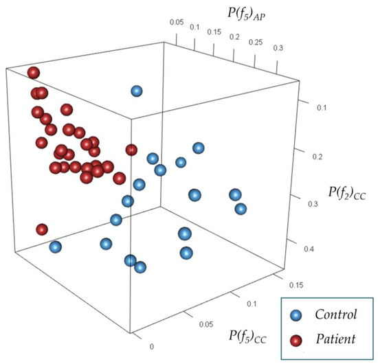 The cluster of the patients and controls based on the three most determining coefficients of the model: the power of the second and fifth frequency in the CC axis and the power of the fifth frequency in the AP axis.