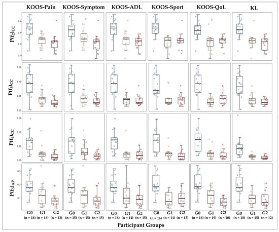 We used KOOS as a subjective measure to estimate the severity of individuals’ problems related to knee OA. We divided the participants into three groups using terciles (33rd and 67th percentiles) for each of the KOOS subscales (pain, symptoms, ADL, sport, and QoL): Individuals with the highest scores or no/mild knee OA (G0), individuals with scores in the middle range or moderate knee OA (G1), and individuals with lowest scores or severe knee OA (G2). We also divided the participants into three groups based on the radiographic classification of knee OA. However, since we did not perform a radiographic examination in healthy individuals, the participants in the control group, patients with KL 1 or 2, and patients with KL 3 or 4, formed G0, G1, and G2 groups for KL classification, respectively. The selected features of the logistic LASSO regression at λ = λ1se were compared between three groups of participants for each KOOS subscale in addition to KL classification.