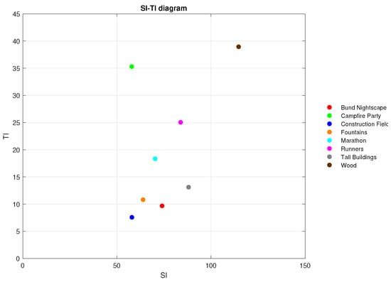 The basic requirements for reference sequences intended for further processing are uncompressed format, high bit depth, resolution and frame rate, suitable aspect ratio, and sufficient diversity in terms of scene content. Meeting all these standards, eight high-quality video sequences were selected from the Shanghai Jiao Tang University dataset [20]. Common parameters of these reference sequences are presented in Table 2. Original sequences vary in temporal (TI) and spatial perceptual information (SI) as shown in Figure 1, colors, contrast, and other features.