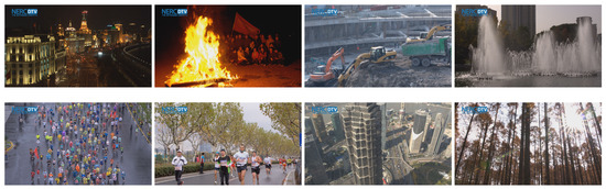 The Bund Nightscape is a time-lapse video sequence capturing cars driving through a night city near a river. The video was shot from a high angle with a static camera. The only sources of movement are passing cars, people in the streets, and flags hoisted on the roofs of buildings. The Campfire Party is a nighttime video sequence, picturing a group of people posing for a photograph by a campfire. The camera is almost still, except for the slight zoom in the end of the sequence. Most of the motion is generated by the blazing flames in the foreground. The Construction Field is a relatively static video sequence depicting an excavator digging a foundation pit on a construction site. Apart from this, the only other movement is caused by several people walking in the background. Fountains is a video sequence showing a large fountain with several jets situated in a small square between trees and buildings in the background. The video was recorded with a still camera; hence only the water gushing from the fountain adds dynamism to the scene. Marathon is a video sequence shot from a bird’s eye view by an almost motionless camera. The scene depicts many people dressed in colorful raincoats competing in a race on a wet asphalt road during heavy rain. Runners is a video sequence capturing dozens of people in numbered jerseys racing on a road lined with trees. Even though the scene is filmed with a static camera, its considerable dynamism is added to by the fast movement of the runners and the wind in the leaves of the trees. Tall Buildings is a video sequence, recorded from a bird’s eye perspective, that captures the tallest Shanghai skyscrapers. The camera pans steadily, revealing a view of the driving cars in the distance, which are the only moving objects in the video. Wood is a video sequence recorded in bright daylight, picturing a sunlit forest. The camera moves with a fairly swift, panning motion. It is the most complex sequence, considering the amount of detail and motion in the video.