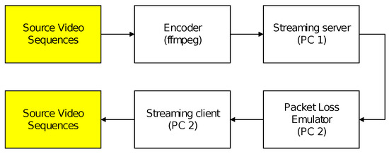Subsequently, a local area network consisting of a streaming server and a streaming client was assembled to serve as a transmission channel for the previously encoded sequences. To simulate a lossy network connection, Clumsy [24] software was installed on the receiving computer, which assumed the role of the streaming client. By employing this tool, a certain percentage of UDP packets from every compressed video sequence was artificially intercepted. To approximate the actual operation of IP networks, clustered packet losses were generated pseudorandomly during video transmission. Both the broadcast server and the client were represented by standard computers—laptops with gigabit LAN ports with the Windows operating system installed. The interconnection of both devices was point-to-point type by using a cat6 metallic network cable. To minimize the occurrence of errors, the Wi-Fi adapters were disabled on both computers and the Windows firewall was also disabled. As for the stream itself, the compressed data was encapsulated in a TS container. The reason for using TS is that it is still currently the most used container for multimedia stream distribution. It is not only in Ethernet networks, but also for distribution in DVB-T/DVB-T2 systems. The transport stream allows multiplexing of streams (PES and PS) that do not necessarily share a common time base for transmission in a noisy environment. Thus, its biggest advantage is robustness to transmission errors. The image data was transmitted as UDP segments by using the RTP transport protocol. RTP was chosen based on the nature of the data. The real-time data and UDP segments are usually used for transmission in broadcast networking, because there is no possibility of retransmitting failed packets. It is not like a video-on-demand service where, in contrast, TCP segments are used. The resulting packet loss rate (PLR) ranged from 0 to 1%. A block diagram illustrating the combined process of video encoding and packet loss simulation is shown in Figure 3.