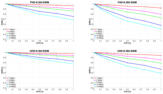 Because the video sequences unaffected by PLR encoded to both H.264 and H.265 in full HD and ultra HD, each bit rate of interest was used as a reference for the objective metrics. It is understandable that the quality of every sequence with 0% PLR was rated with an SSIM value of 1. Another common feature of Figure 4 is the tendency to objectively measure video quality at all bit rates to decline with the increasing PLR, as was anticipated. A full-reference objective metric such as SSIM always evaluates a video that lacks more information as of lower quality. An interesting discovery is that increasing PLR had a greater negative effect on the quality of full HD sequences than those in ultra HD resolution. Moreover, videos encoded to H.265 were rated worse on average than H.264-encoded sequences. The last and most unexpected finding is a faster decrease in the quality of sequences with a higher bit rate, which is clearly observable with all combinations of codec and resolution used. This fact, although counterintuitive because the quality of the compressed sequences with 0% PLR grows with the increasing bitrate, may have a logical explanation. For illustration, file sizes of the H.265 ultra HD Marathon video sequence at all examined bit rates are presented in Table 5. It is self-explanatory that by applying the same PLR, more bytes of data will be lost from larger files. Although the loss probability remains unchanged, it will most likely not affect the same part of the compressed sequences. It also will not affect the same number of parts of the video compressed at different bitrates, which is more important. This is due to the fact that the average size of the captured UDP packets is equal for each streamed sequence, which means that at a higher bit rate, the number of lost packets must also be larger. Therefore, most individual losses occur when video at 15 Mbps is transmitted. As the research in [28] proves, video quality degrades more significantly when several individual packets are lost than in a case when loss of the same number of consecutive packets occurs, which can be attributed to the temporal propagation of the errors. Regarding our investigation, it follows that the higher the bit rate used, the more individual or clustered packet losses will occur. Although at higher bit rates the losses are likely to affect a smaller portion of the frames, they may continue to propagate in time and space, causing more substantial video quality degradation.