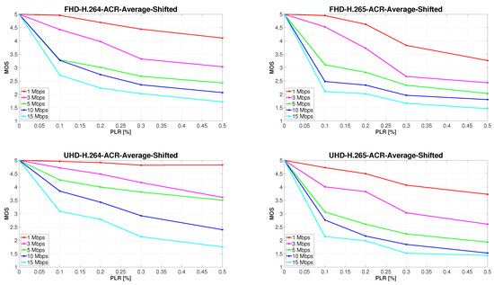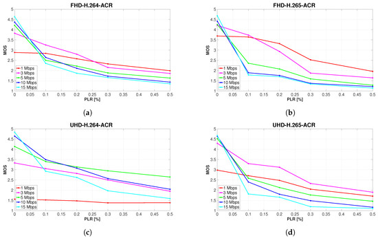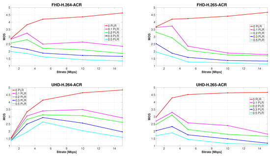 Although this paper focuses mainly on the impact of PLR, the subjective method used made it possible to further examine the mixed impact of PLR and compression on subjectively perceived video quality. To illustrate this combined effect, it was sufficient to leave the MOS values unchanged in the graphical representation of the results. This can be seen in Figure 6, which shows the overall picture of the development of perceived video quality affected by alteration of the compression parameters and the gradual increase in PLR. Each graph displays the average MOS values over all four types of sequences with different content. On the x-axes, PLR within the narrowed limits 0–0.5% is plotted, and the y-axes represent the measure of video quality on the five-level MOS scale.