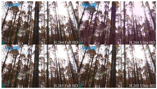 The essential distinction between the evaluation results of H.264 and H.265-encoded videos is the significantly more pronounced gap between the rating of lower bit rates (1 and 3 Mbps) compared to videos encoded at higher bit rates (5, 10, and 15 Mbps), which is evident on H.265 full HD sequences. This phenomenon is most eloquent when the simulated PLR reaches values from 0.1 to 0.2%. Another difference is a steeper decline in H.265 video quality, observable primarily at 10 and 15 Mbps. Unlike full HD videos, ratings of H.264-encoded ultra HD sequences diverged significantly from those at H.265 format. The only common aspects of Figure 6c,d are those that are universal for all four charts. As can be seen in Figure 6c, the average MOS of H.264 sequences shows that respondents considered 10 Mbps videos to retain the highest quality, when 0.1% packets were discarded during transmission. At higher PLR, 5 Mbps video sequences achieved the best subjective score. Although 1 Mbps sequences were rated higher than expected in the majority of the cases (as shown in Figure 6a,b,d), the quality of each H.264 ultra HD video at this bit rate was considered poor or bad, regardless of the PLR. It is therefore clear that in this particular case, the effect of compression on video quality was more intrusive than the loss of visual information. There is a straightforward explanation for this phenomenon, supported by Figure 7. The quality of H.264 ultra HD sequences at low bit rates is worse than the quality of the corresponding Full HD videos because four times the amount of information is discarded during compression due to the higher resolution. This effect is less pronounced when employing the H.265 codec, as HEVC compression is approximately 40% more efficient than older AVC [31].